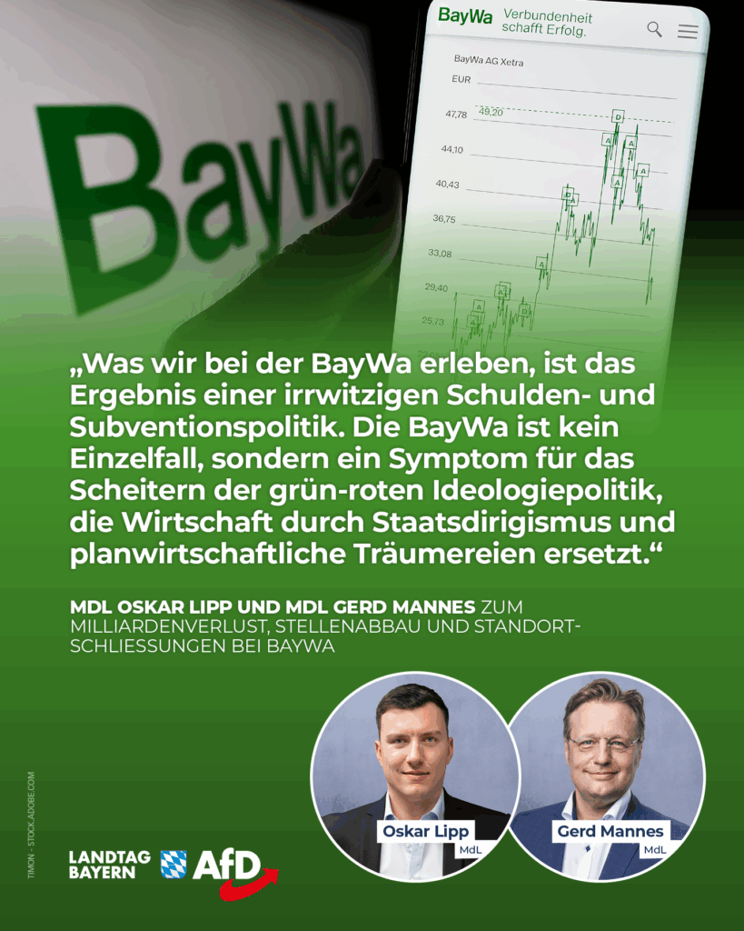 „Was wir bei der BayWa erleben, ist das Ergebnis einer irrwitzigen Schulden- und Subventionspolitik. Die BayWa ist kein Einzelfall, sondern ein Symptom für das Scheitern der grün-roten Ideologiepolitik, die Wirtschaft durch Staatsdirigismus und planwirtschaftliche Träumereien ersetzt. Wir fordern: Stopp der Energiewende, Nein zu den Schuldenexzessen, Rückkehr zur marktwirtschaftlichen Vernunft!“